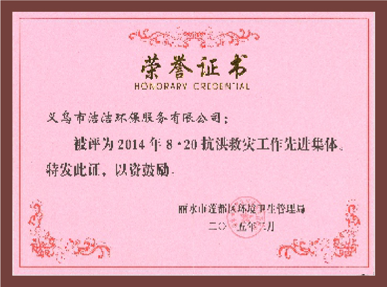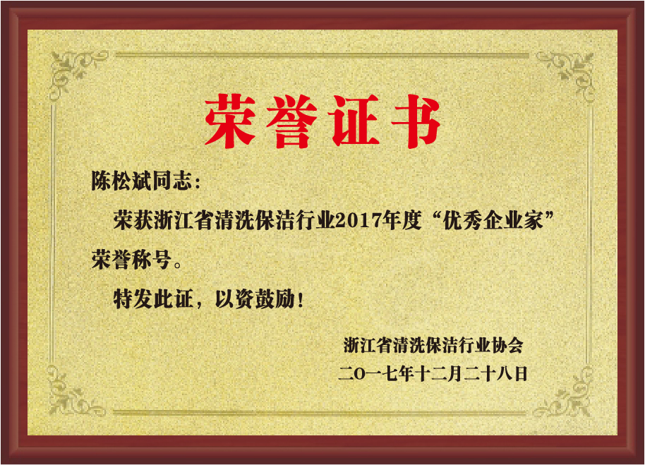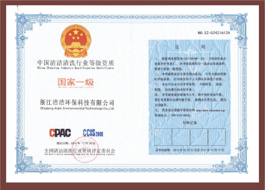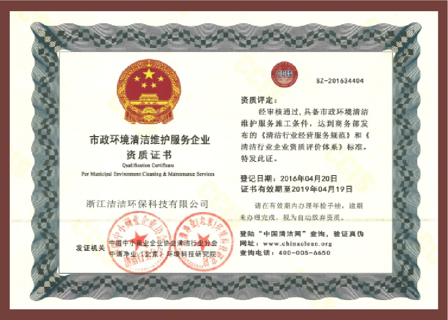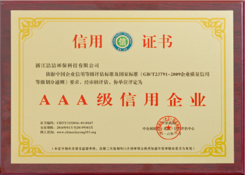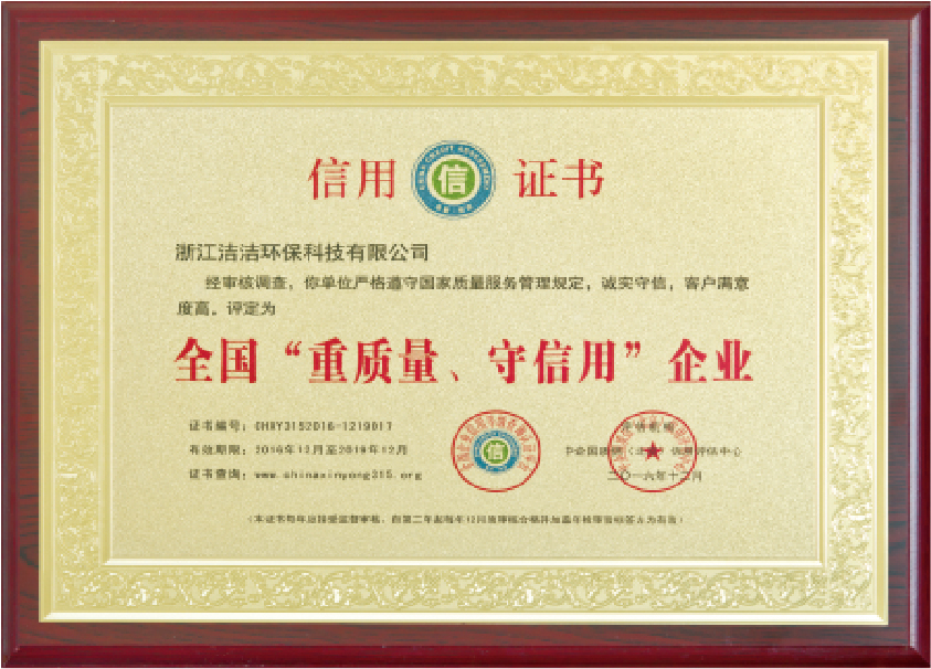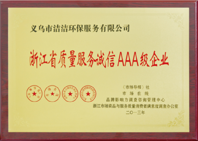 重要榮譽(yù):“全國信用等級AAA級企業(yè)”、全國“重質(zhì)量、守信 用企業(yè)”、“浙江省質(zhì)量服務(wù)誠信AAA級企業(yè)”、中國中小商業(yè) 企業(yè)協(xié)會清潔行業(yè)分會常務(wù)理事員會單位